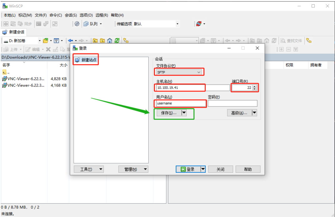 打开winscp工具,依次确认下图中红框中内容(用户名请填写实际名字,下方以username用户为例)