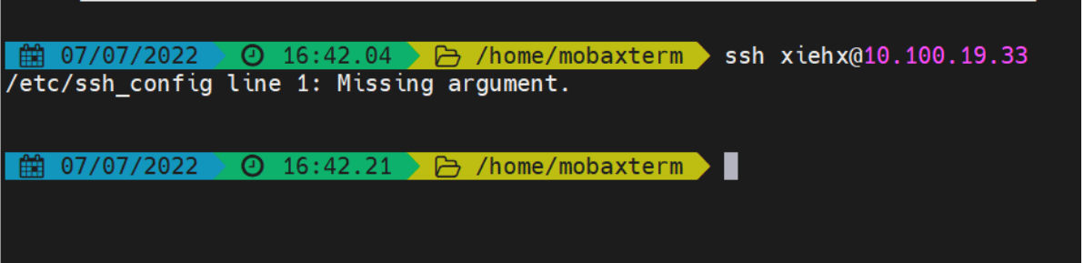 如果遇见 /etc/ssh_config line 1: Missing argument. 问题,如下图所示: