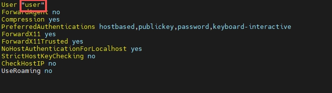处理方法是编辑报错的 /etc/ssh_config 文件,添加或修改第一行的引号内的内容为当前电脑的用户名,假设当前电脑的用户名为user,则: